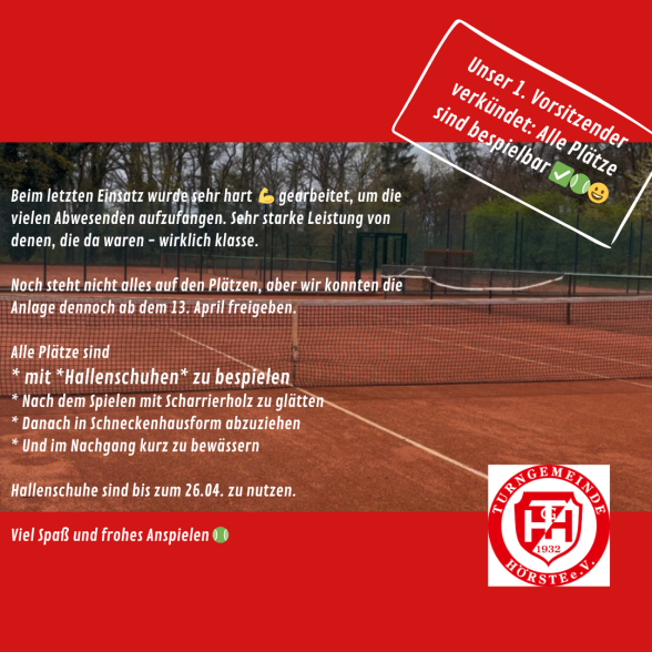 Beim zweiten Einsatz, am 25. März, ging es draußen vor allem Laub und Unkraut an den Kragen, während drinnen die Pinsel geschwungen wurden. Alles in allem sind die Arbeiten im (noch) Zeitplan. Allerdings hätte es ruhig die eine oder andere helfende Hand mehr sein können. Wenn die notwendigen Restarbeiten ausgeführt müssen, gibt es noch eine Info, um auch noch Arbeitsstunden leisten zu können. Dann lasst uns jetzt auf "gutes" Wetter hoffen, damit wir so früh wie möglich die ersten Bälle spielen können.
