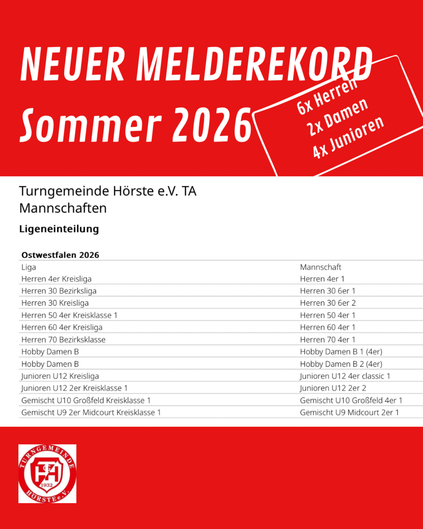 Dann geht es Anfang Mai auch schon mit den Mannschaftswettbewerben los. „Hier verzeichnet die TG einen neuen Rekord für sich. Sechs Herren-Teams, ein Damen-Team und zwei Jugendmannschaften sind dafür angemeldet“, verkündet Sportwart Torben Lüker nicht ohne Stolz.