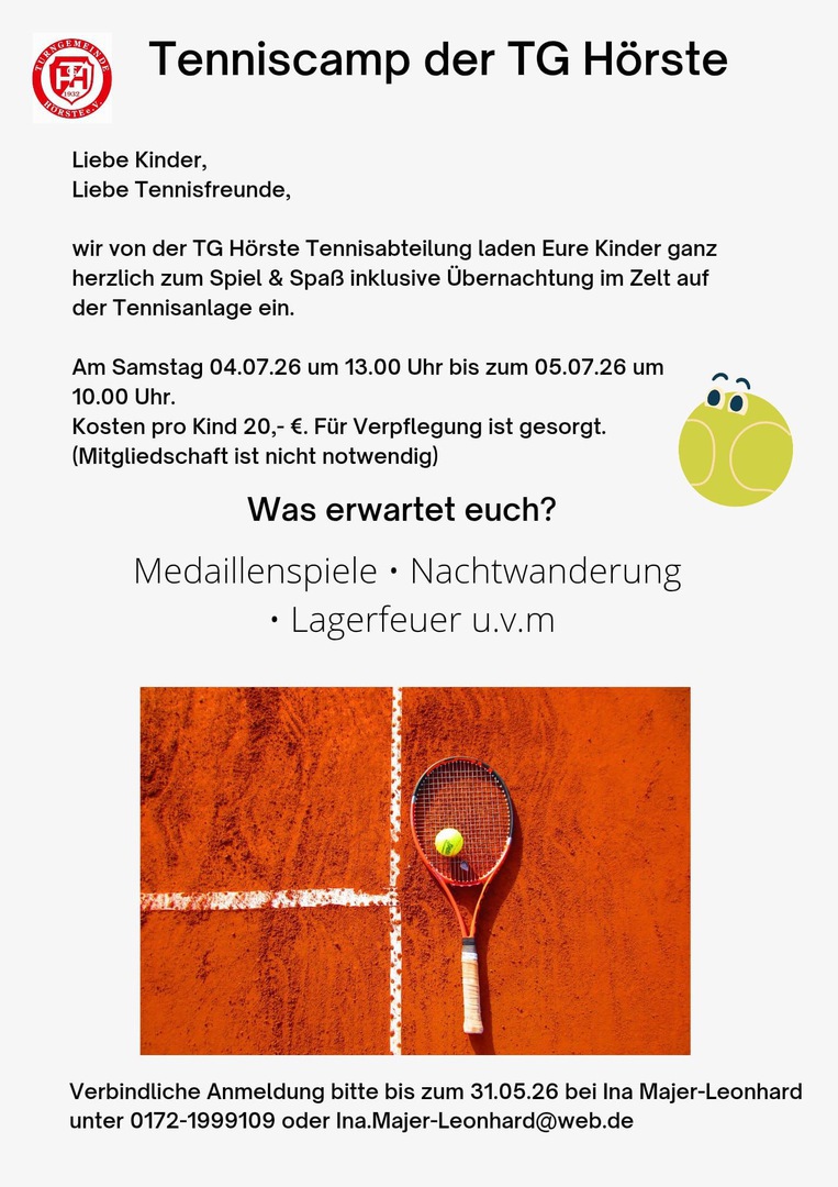 Nach jahrelanger Pause startete das Tenniscamp, welches im Verein auf eine lange Tradition zurückblicken kann, erstmals wieder am 27. und 28. August mit 13 Kindern und 3 ehrenamtlichen Mitgliedern unter der Regie von Jugendwart und Vereinstrainer Christopher Parohl und seiner Frau. Highlights waren die Übernachtung im Zelt, Medaillienspiele, Tennistraining en masse und eine Nachtwanderung. Alles verbunden mit viel Spaß und Freude. Am Ende des Tages hatten wir glückliche und erschöpfte Kinder. Als Erinnerung bekam jedes Kind eine Medaille und ein Tenniscamp-Erinnerungs-T-Shirt - natürlich in den Farben Vereinsfarben. Alle sind sich einig: Das Tenniscamp soll wieder fester Bestandteil im Jahreskalender werden.