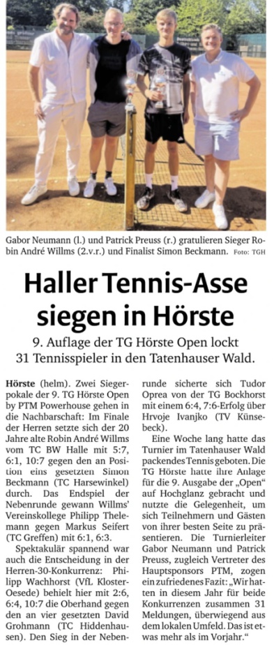 Die Tennisabteilung der TG Hörste hat zum dritten Mal in Folge die TG Hörste Open ausgerichtet. Anders wie bei den beiden vorherigen Auflagen wurde das Turnier erstmalig in zwei Konkurrenzen ausgetragen. Nach sechs spannenden Turniertagen (06. – 11. August 2019) auf der Tennisanlage in Tatenhausen setzten sich dabei zur Freude von Turnierdirektor und 1. Vorsitzenden der Tennisabteilung Nico Schulz jeweils Spieler der TG Hörste als Sieger durch. In der Konkurrenz Herren LK 6 bis LK 16 siegte Manuel Bertling vor Tim Farthmann (TG Bockhorst) und Benjamin Fila (TuS Spenge). Geheimfavorit Christoph Ramhorst gewann das Finale in der Konkurrenz Herren LK 17 bis LK 23 souverän mit 6:1 und 6:0 gegen Niklas Kelle vom FC Stukenbrock. Dritter wurde Thomas Unruh von der TG Bockhorst. In der dazugehörigen Nebenrunde setzte sich zudem Philipp Ramhorst im Finale gegen Jan Dieckmann vom TC 71 Gütersloh mit 6:1 und 6:4 durch.
